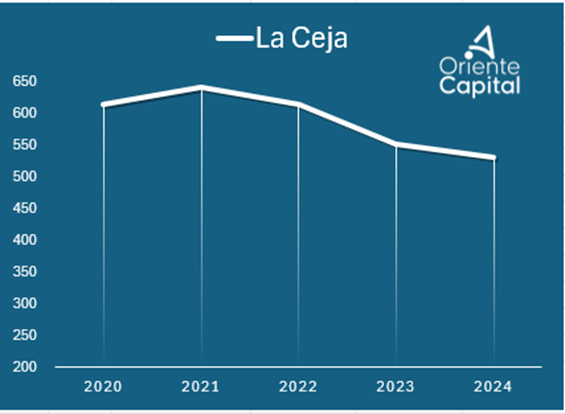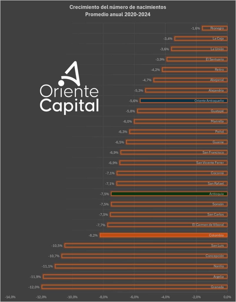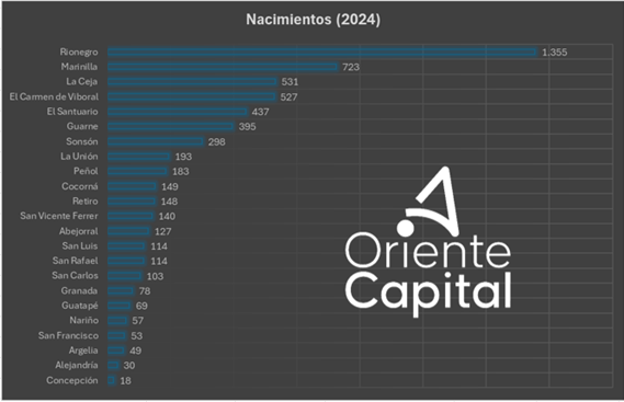 Otras localidades como Marinilla, Santuario, Guarne y Peñol, también decrecen por debajo del promedio departamental y nacional. De hecho, los únicos que superan el promedio nacional son municipios relativamente pequeños en población como San Luis, Concepción, Argelia, Nariño y Granada. Concepción, por ejemplo, solo reportó 18 nacimientos en 2024, el número más bajo de la región; adicionalmente, tiene una tasa de decrecimiento promedio del -10,7% anual. Granada, por su parte, es el campeón del decrecimiento poblacional con una tasa del -12% promedio anual, con una caída vertiginosa entre los años 2022 y 2024.
