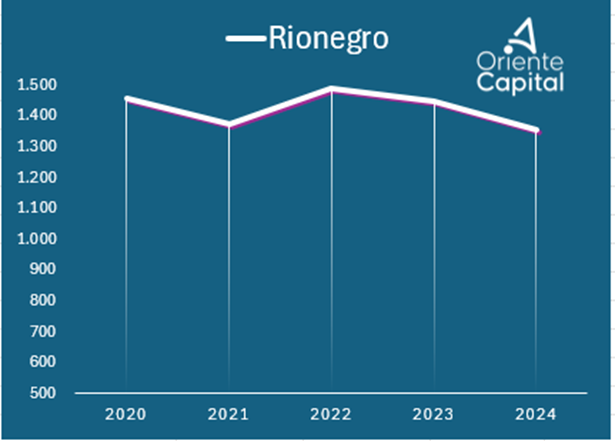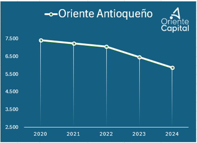 La tendencia que muestra el Oriente Antioqueño los datos en los últimos 5 años es clara en dos sentidos. El primero es que el número de nacimientos viene cayendo consistentemente, lo cual se aceleró en el año 2024. El segundo, es que, si bien el Oriente viene cayendo como todo el país, lo hace un ritmo menor. Mientras que Colombia viene cayendo en promedio al -8,2% anual, Antioquia lo hace más lentamente al -7,5% y Oriente mucho más al -5,6%.