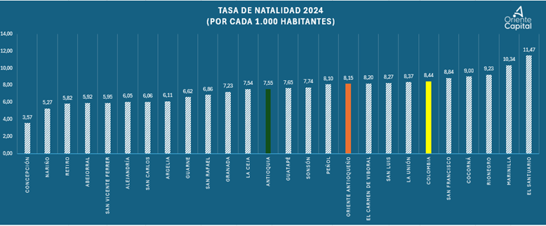 Por otra parte, la estadística que debe tenerse en cuenta para medir el nivel de natalidad de cada municipio de forma proporcional con su población se denomina tasa de natalidad. Esta equivale al número de nacimientos reportados por cada 1.000 habitantes. En este sentido, el municipio del Santuario lidera la región con una tasa de natalidad de 11,47, seguido por Marinilla con 10,34 y Rionegro con 9,23 en el último año.